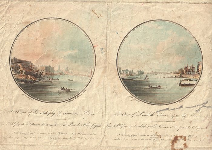 A Wiew of the Adelphy & Somerset House. Vue d'Adelphy de la Mason de Somerset et du Pont de Blak fryars. A Wiew of Lambeth Church upon the Tame. Vue de l' Eglise de Lambeth sur la Taise et du pont de Westminster.