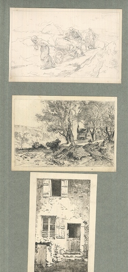 _. 3 Orig.-Studien (Bleistift- u. Tuschezeichnungen) auf Papier, auf Karton montiert. 11 x 15, 5 cm u . 15, 5 x 10 cm. Etwas gebräunt, sonst gut erhalten, 2 verso mit Skizze.