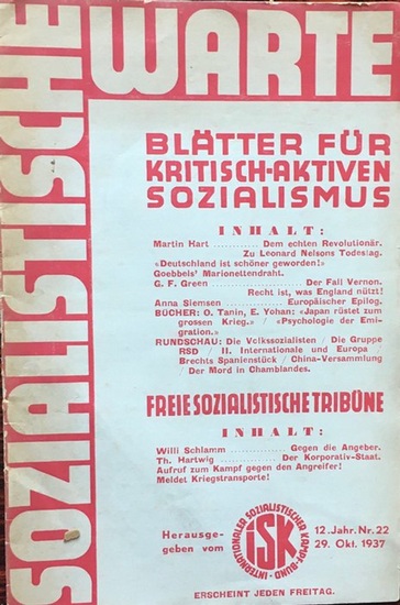 SOZIALISTISCHE WARTE. Blätter für kritisch-aktiven Sozialismus. FREIE SOZIALISTISCHE TRIBÜNE. Hrsg. vom Internationalen sozialistischen Kampf-Bund. 12. Jahr Nr. 22. 29. Oktober 1937.