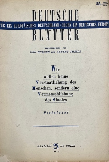 Santiago de Chile: Deutsche Blätter. 1946. 27 x 18,5 cm. 4.Jahr 1946, 28.- 34. Heft(Nov./Dez.1945 - Nov./Dez.1946). Beiträge: Das geheime Ribbentrop - Molotov Abkommen von Aug.1939; J. Urzidil, Julius Bab, Stefan Andres, Paul Zech, Otto Klepper, Werner Bergengruen, Kurt Hiller, Thomas Mann, S. Friedländer, Albert Schweizer, Ernst Wiechert, u.v.a.