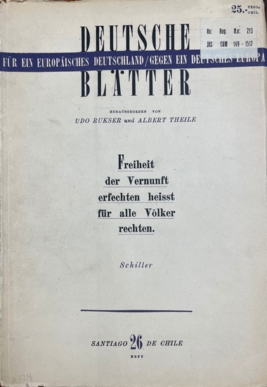 Santiago de Chile: Deutsche Blätter. 1945. 27 x 18,5 cm. 3.Jahr 1945, 26.und 27. Heft (Juli-Okt.). Beiträge: Wiedergeburt oder Untergang des Abendlandes?; Grundsätzliches zu den Potsdamer Beschlüssen; Der wahre Sinn von Buchenwald; Julius Bab, Thomas Mann's Josephs Dichtung; Gustav Regler, Kurt Bondy, Arnold Brecht, Paul Zech, Wolfgang Stresemann, Albert Ehrenstein.