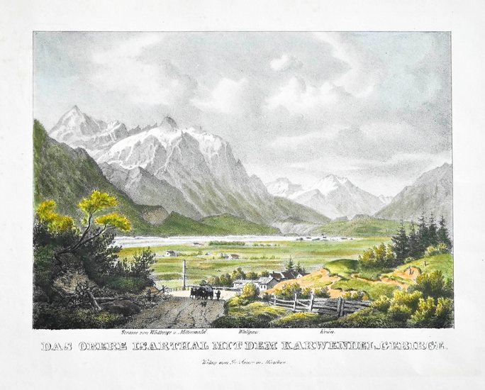 München, 1837. circa 18 x 22 cm (Blatt)., 1 Blatt. verso weiss Blick durch das Tal auf die Berge, im Vordergrund ein Wagen mit Pferden auf der Strasse von Wallersee und Mittenwald, vor den Bergen Wallgau und Krün. Wohl aus der Folge "Alpenblumen".